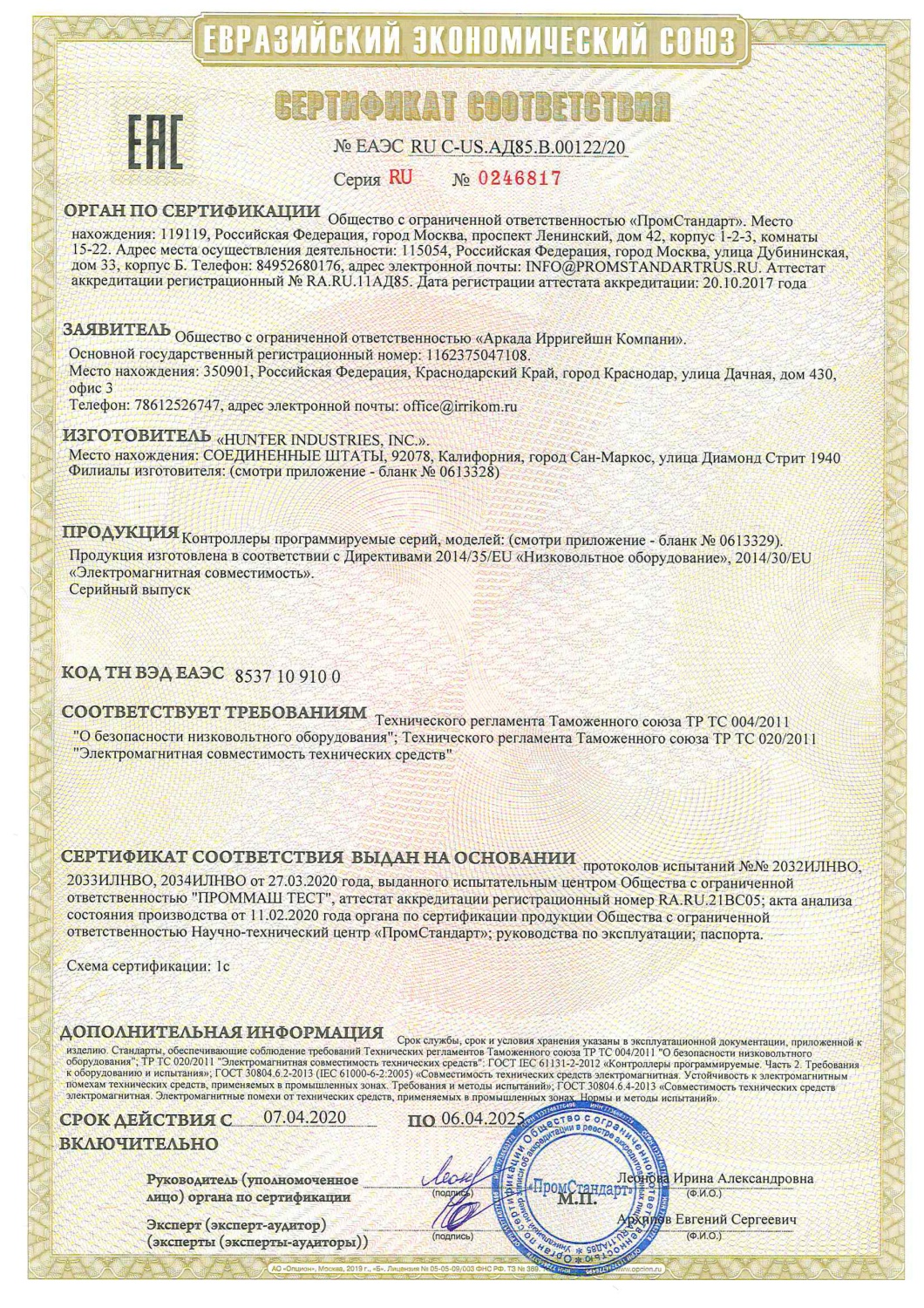 Сертификат Соответствия Hunter. Контроллеры программируемые.